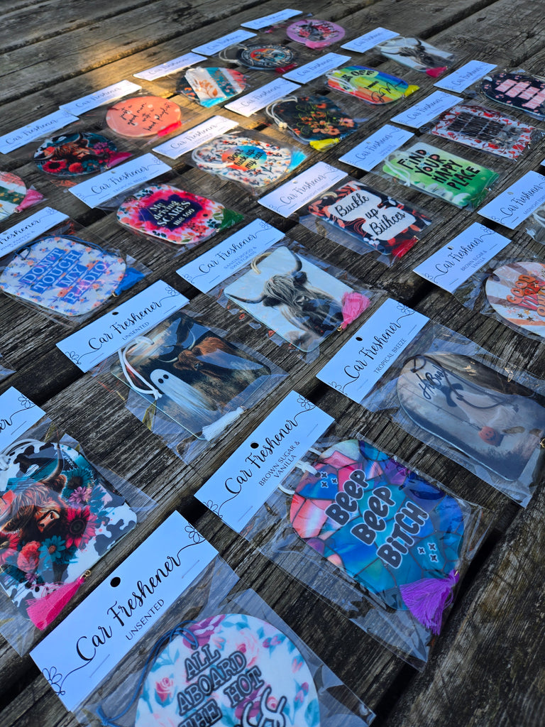 These reusable Air fresheners are available in assorted scents, colors and patterns.