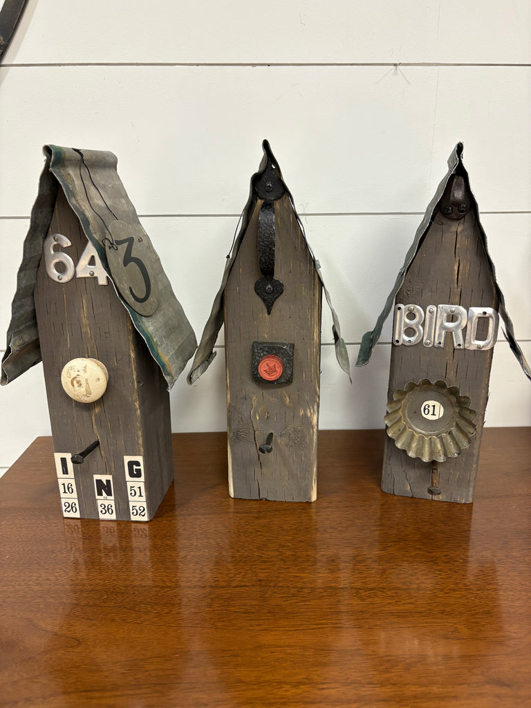 Made out of vintage reclaimed items. Each one of these bird houses are handmade and one of a kind.